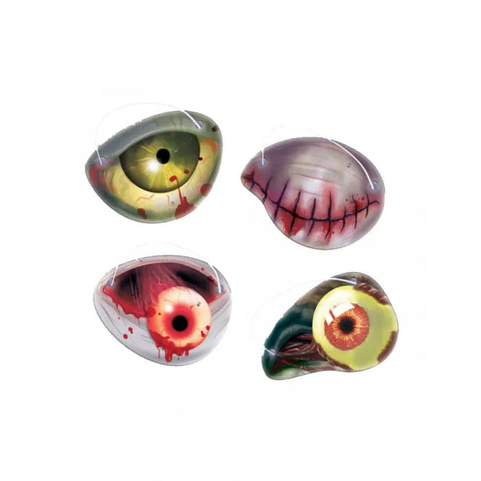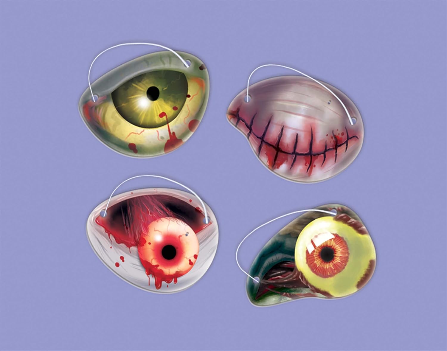 Coole Zombie-Augenklappen als Kostümzubehör & für dein Fotobooth! Mit dem 12-teiligen Zombie-Augenklappenset bringst du die Outfits deiner Zombie-Partygäste an Halloween auf das nächste Level oder nutzt das coole Set für dein Fotobooth. Dieses Party-Accessoire wird vor allem Kinder begeistern! Das Set enthält vier verschiedene Augenmotive aus Papier: ein zugenähtes grau-rotes Auge, ein grünliches Auge mit geplatzten roten Äderchen, ein rotes Auge, das aus der Augenhöhle hängt, und ein grünes Auge, das an Muskeln neben dem eigentlichen Auge baumelt. Alle Augenklappen lassen sich mit einem Gummiband über den Kopf ziehen. Zusammen mit unseren Monster-Einladungskarten kannst du eine echte Monsterparty feiern!