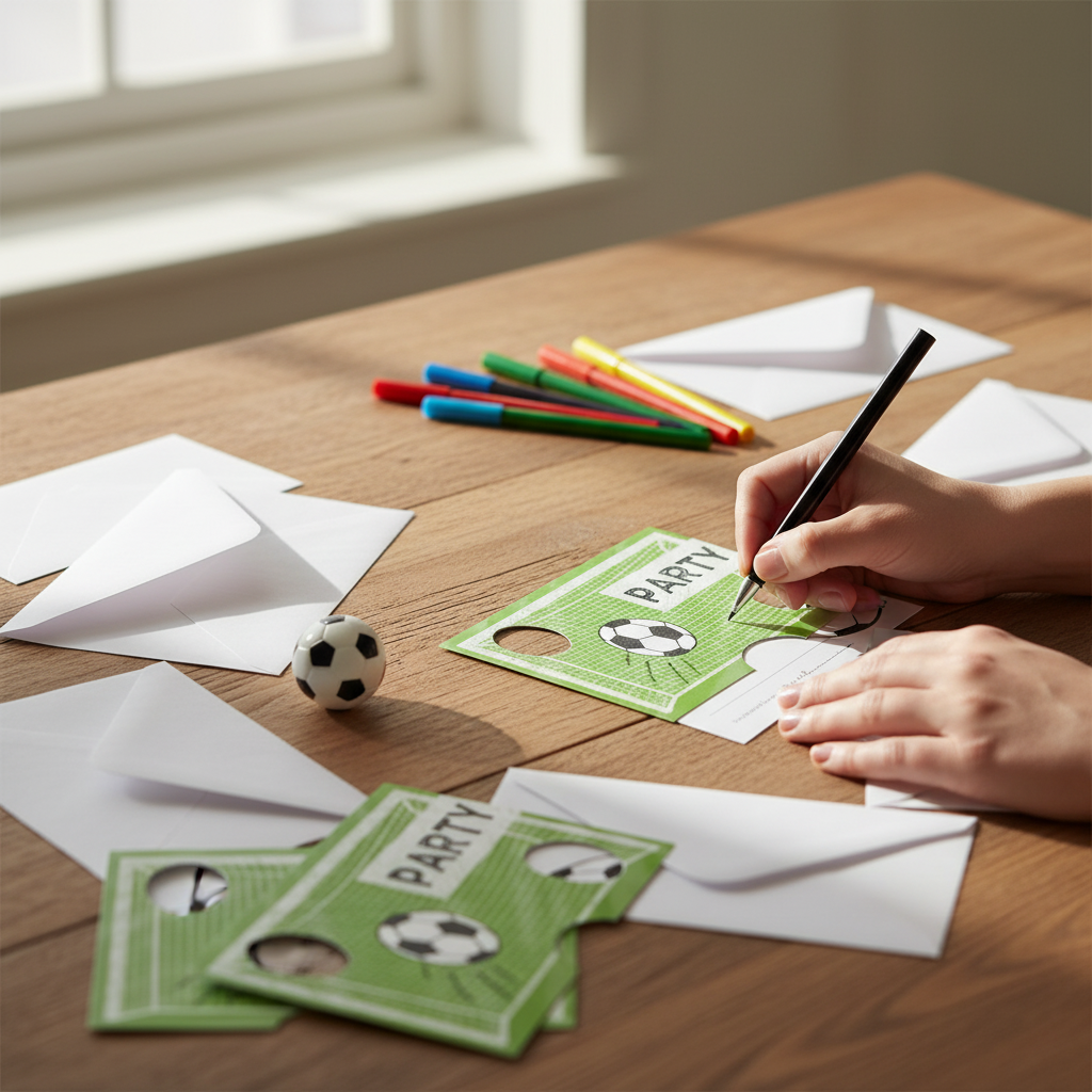 Die Einladungskarten "Kicker Party" kommen im 8er Pack mit passenden weißen Umschlägen (ca. 14,5 x 9,5 cm). Gefaltet messen die Karten ca. 14 x 8 cm, entfaltet etwa 14 x 24 cm. Die Außenseite ist grün und mit einer Torwand bedruckt, inklusive des Schriftzugs „Party“ und zwei Aussparungen. Also, Papierkügelchen bereithalten! Innen gibt es 19 Linien, die darauf warten, mit allen wichtigen Party-Infos beschrieben zu werden.