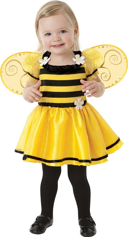 Unser Baby Buzzy Bee Little Stinger Kostüm besteht aus einem entzückenden schwarz-gelb gestreiften Kleid mit einem vollen gelben Rock und Gänseblümchen-Blumenapplikationen. Abnehmbare, gewirbelte gelbe Flügel im Lieferumfang enthalten!