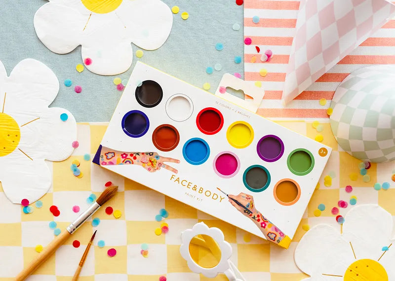 Gesichtsmalfarben, Set enthält 2 Pinsel und besteht aus 12 Farben: hellgrün, dunkelgelb, dunkelgrün, lila, gelb, rosa, rot, blau, weiß, braun, schwarz, dunkelblau.