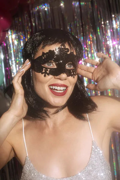Karnevalsmaske in schwarzer Farbe, ca. Maße 17 x 9 cm. Mit einem Band gebunden.