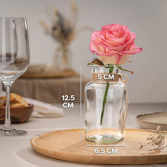 12 Kleine Glasvasen - 12,5 cm hoch - Inklusive Juteschnur - Vintage Design - Traumhafte Deko für Hochzeit - Spülmaschinenfest.