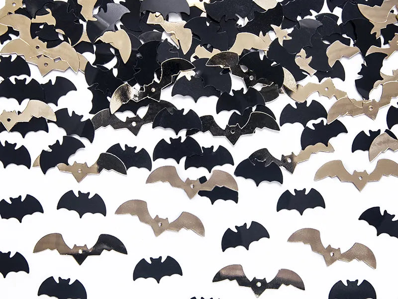 Konfetti Fledermäuse in Schwarz und Gold, Abmessungen 1,7x0,7 Zentimeter, 2,5x0,7 Zentimeter.