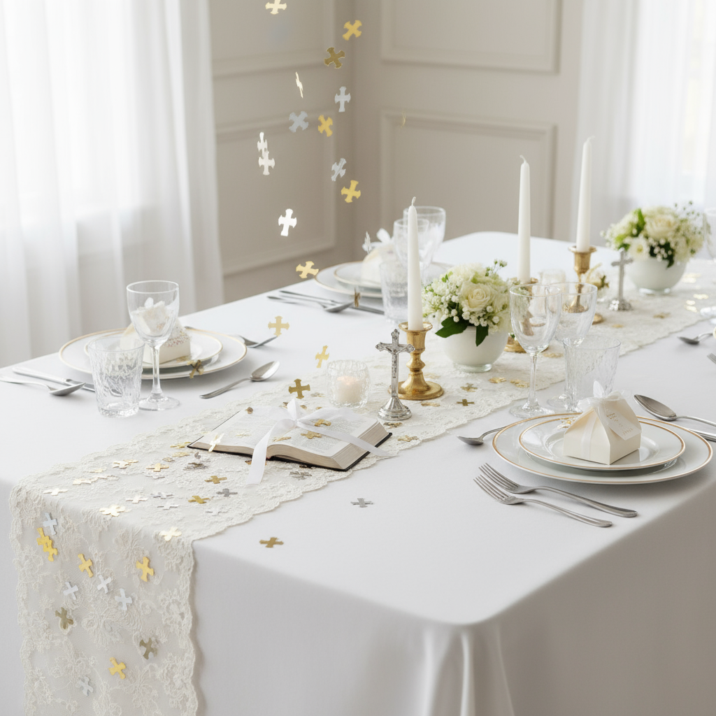 Das Konfetti-Kreuz ist die perfekte Ergänzung zur Tischdekoration für die Taufe.