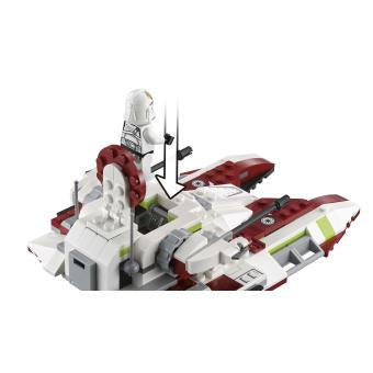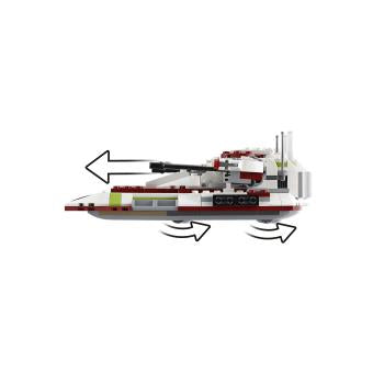 - Der Republic Fighter Tank verfügt über eine aufklappbare Dachluke mit Minifiguren-Cockpit, zwei hochschwenkbare Geschütze mit Shootern, ein Heckmunitionsfach und verborgene Räder, die das Modell „schweben“ lassen.