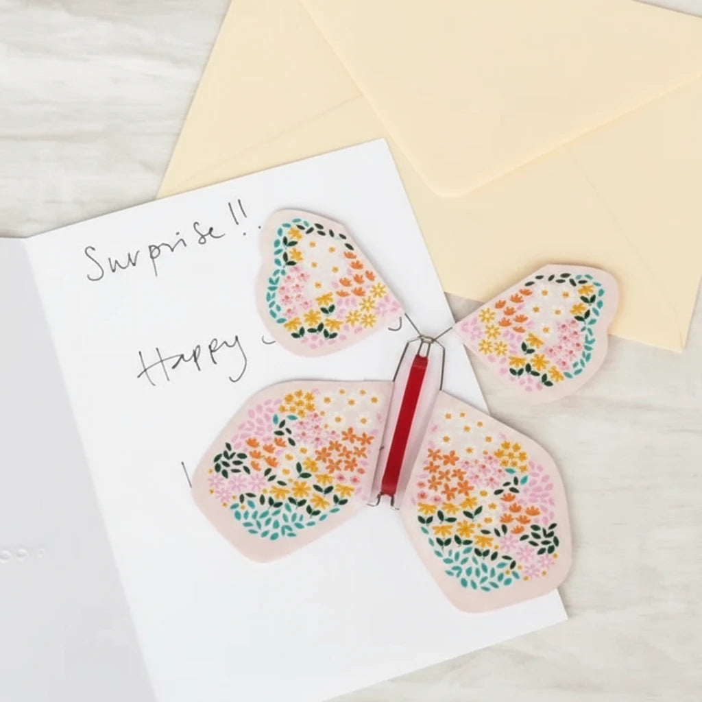 Nachdem der Schmetterling aufgezogen wurde, einfach in ein Buch oder eine Karte legen - beim Öffnen des Buches oder der Karte flattert der Schmetterling heraus!