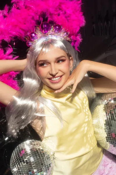 Stirnband Discokugel in rosa Farbe mit irisierenden Details, Maße ca. 17,5 x 17,5 cm.