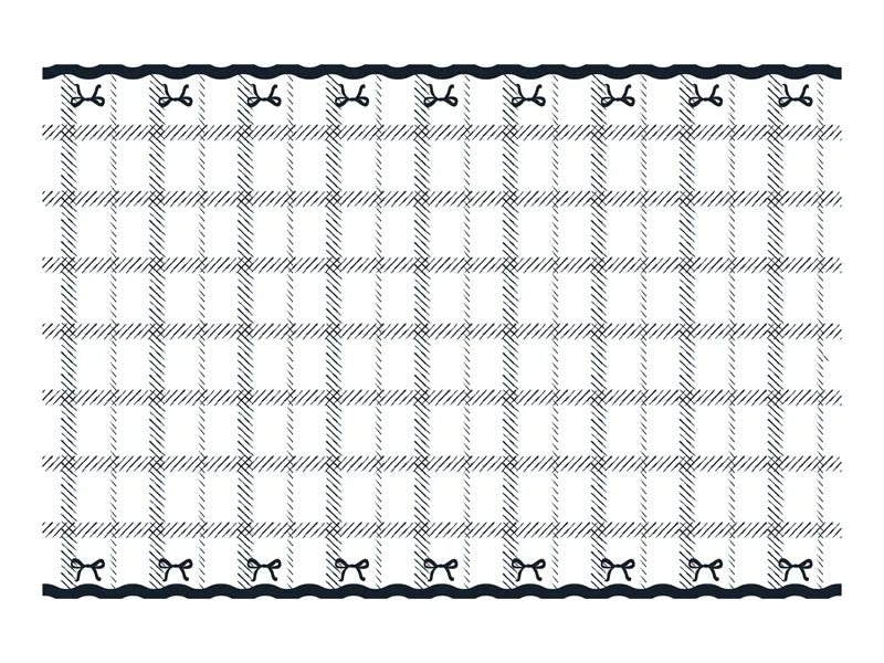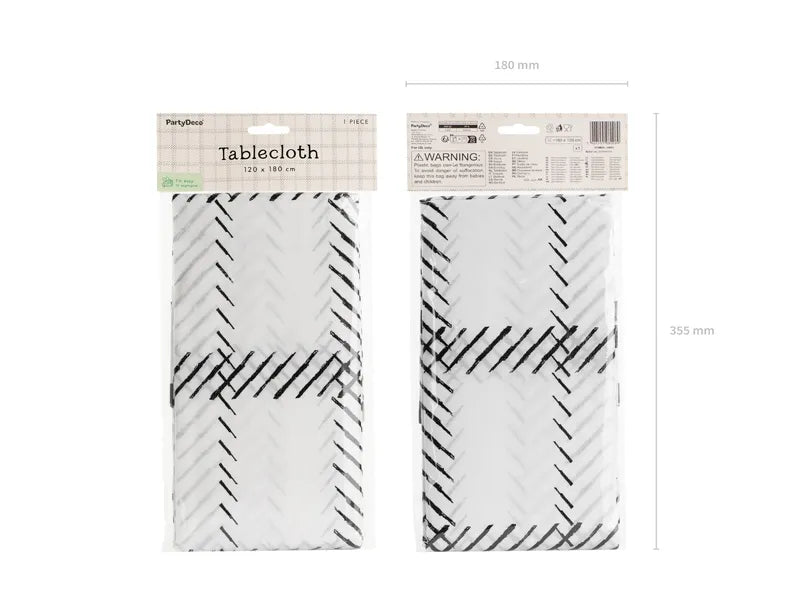 Einseitige und Einweg-Tischdecke mit einer Länge von 180 cm und einer Breite von 120 cm, Farbmix. Die Tischdecke ist mit schwarzen Schleifen und einem Karomuster bedruckt.