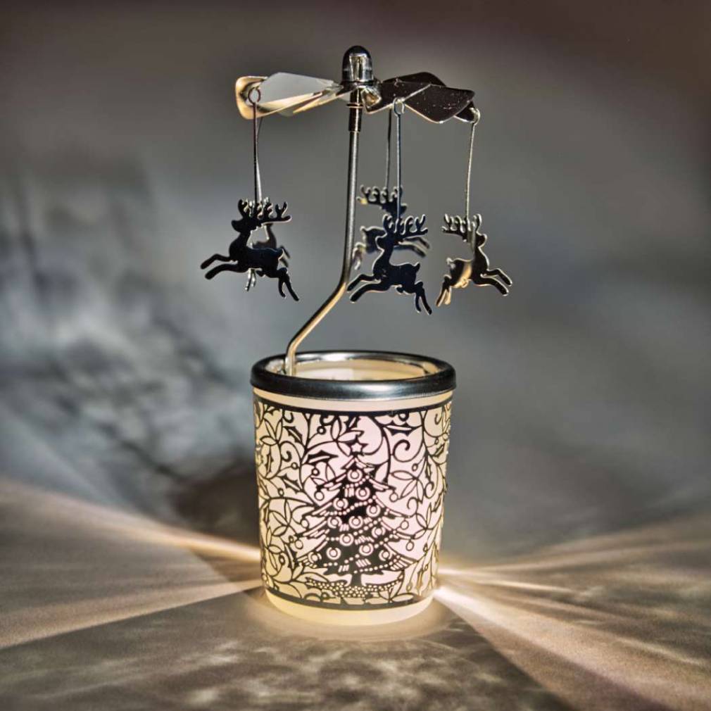 Dieser Teelichthalter besteht aus einem milchigen Glasbecher. Der Glasbecher ist mit einem dünnen Blech ummantelt aus dem die Motive ausgestanzt sind. Ebenso sind die 5 passenden Hänger aus dünnem Blech gearbeitet, die am Flügelrad eingehängt werden.